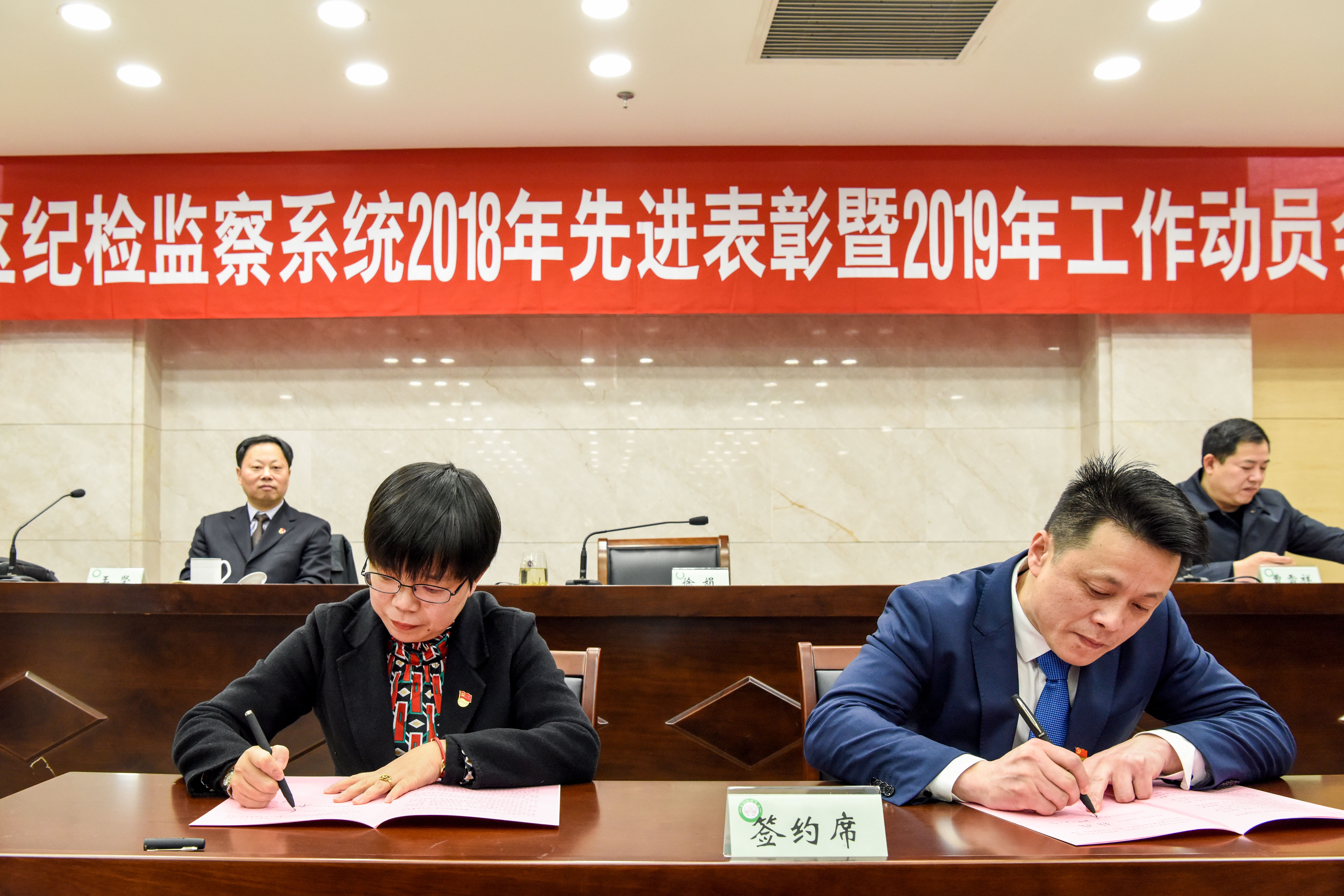 会上,通报表扬了全区2018年度“十佳”纪检监察工作者、纪检监察系统先进集体及纪检监察系统信息宣传工作优胜单位,签订了党风廉政建设责任书。