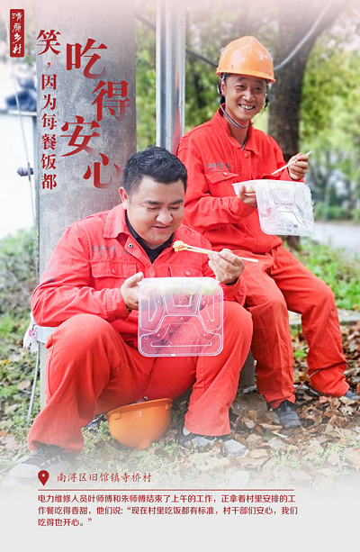 南浔区旧馆镇寺桥村电力维修人员叶师傅和朱师傅结束了上午的工作,正拿着村里安排的工作餐吃得香甜,他们说:“现在村里吃饭都有标准,村干部们安心,我们吃得也开心。”