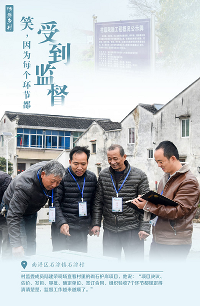 南浔区石淙镇石淙村村监委成员陆建荣现场查看村里的砌石护岸项目,他说:“项目决议、估价、发包、审批、确定单位、签订合同、组织验收7个环节”