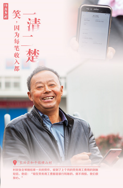长兴县和平镇横山村村民张会琴刚结束一天的劳作,收到了上个月的劳务用工费用的到账短信,他说:“现在劳务用工费都是银行转账的,做不得假,我们很放心。”