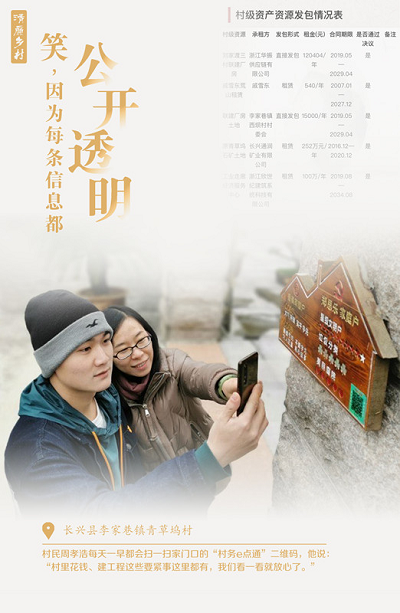长兴县李家巷镇青草坞村村民周孝浩每天一早都会扫一扫家门口的“村务e点通”二维码,他说:“村里花钱、建工程这些要紧事这里都有,我们看一看就放心了。”