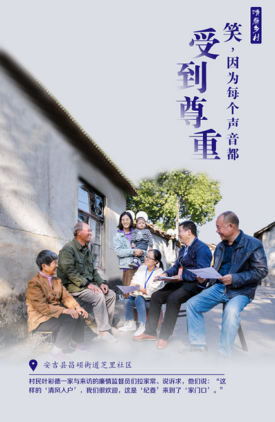 安吉县昌硕街道芝里社区村民叶彩德一家正与来访的廉情监督员们拉家常、说诉求,他们说:“这样的‘清风入户’,我们很欢迎,这是‘纪委’来到了‘家门口’。”