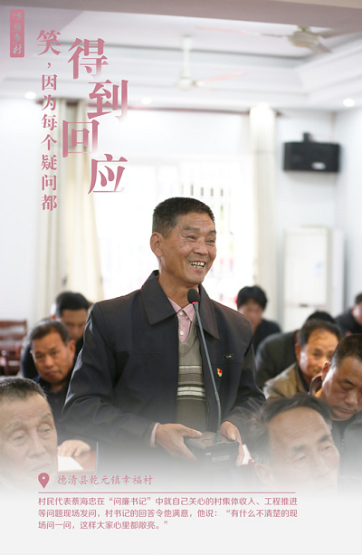 德清县乾元镇幸福村村民代表蔡海忠在“问廉书记”中就自己关心的村集体收入、工程推进等问题现场发问,村书记的回答令他满意,他说:“有什么不清楚的现场问一问,这样大家心里都敞亮。”