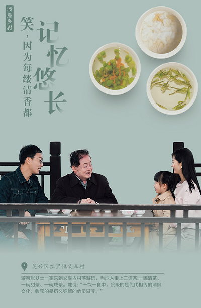 游客张女士一家在吴兴区织里镇义皋村游玩,当地人奉上三道茶:一碗清茶、一碗甜茶、一碗咸茶。她说:“一饮一食中,吮吸的是代代相传的清廉文化,收获的是历久弥新的心灵滋养。”